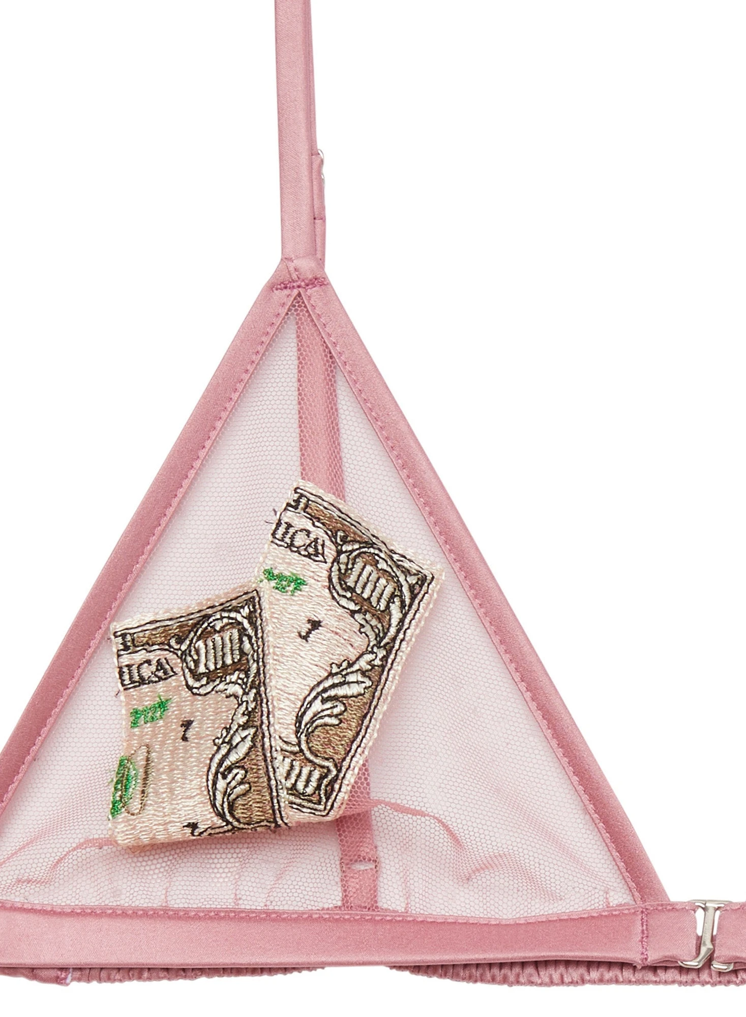 It’s all about the Benjamins, baby. Indulge with our Big Spender Embroidery Triangle Bra, featuring custom cash embroidery on sheer tulle ground. Luxe silk trim with adjustable straps and front closure. Complete this seriously sexy set with the matching Big Spender Embroidery V String.