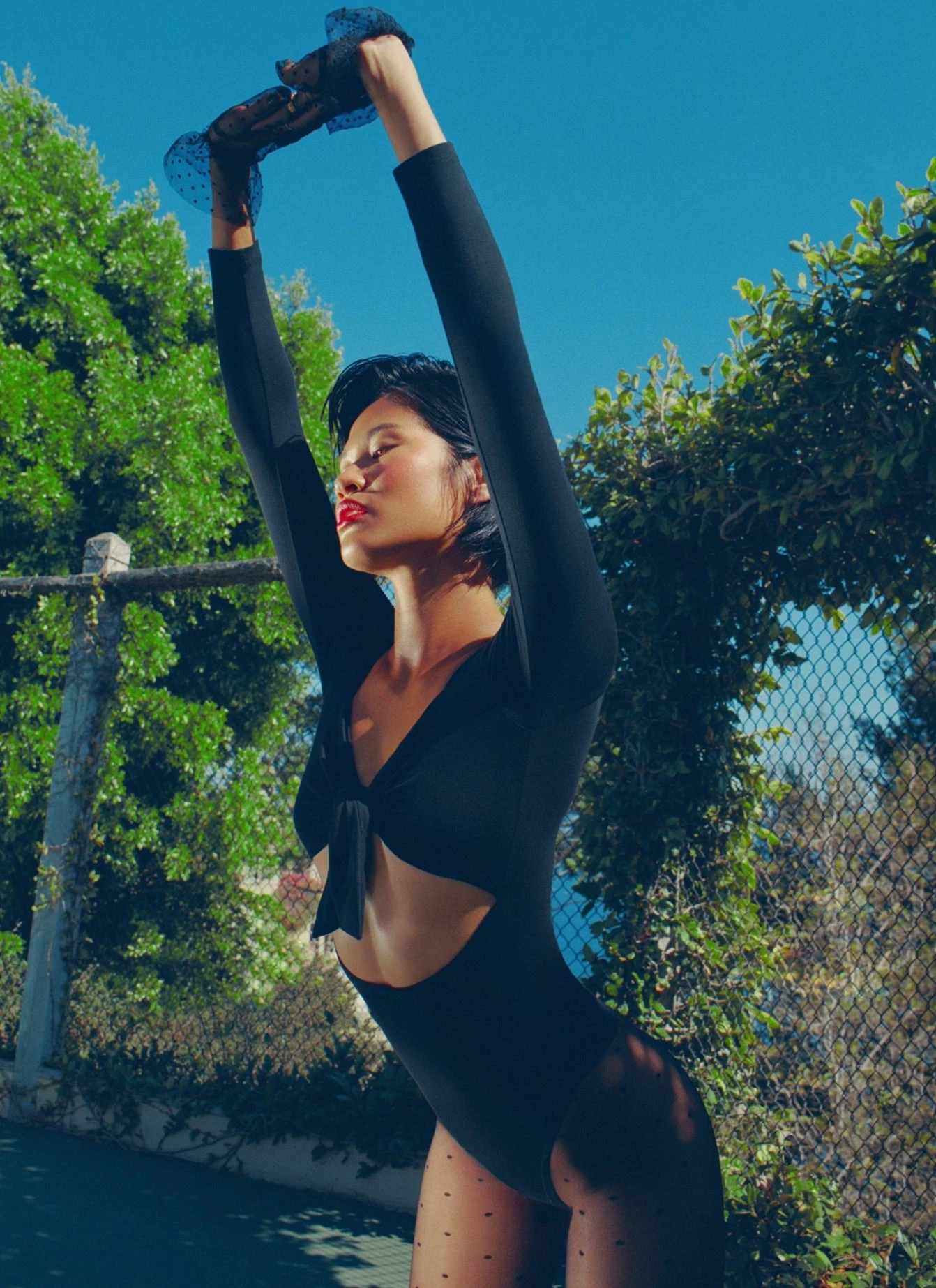 Undo me. Our ultra flirty Bow Bodysuit with playful front cut out and tie front. Cut from soft stretch jersey that hugs your body in all the right places. Thong cut. We love it with the mushroom print Bedroom to Boardroom Pant.