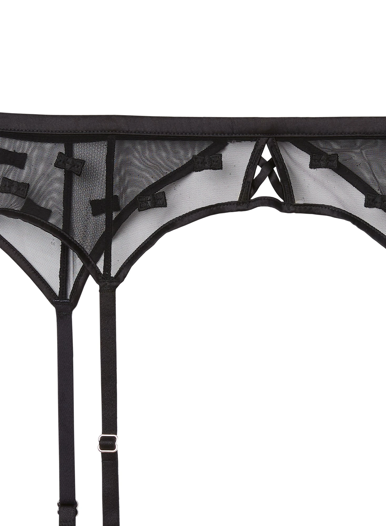 Our Bow Embroidery Garter Belt is the perfect addition to amp up your lingerie set. Features allover bow embroidery with criss cross keyhole detailing at front. Center back closure sits at waist. Pair with the matching Bow Embroidery Peekaboo and Thong for an immaculate set.