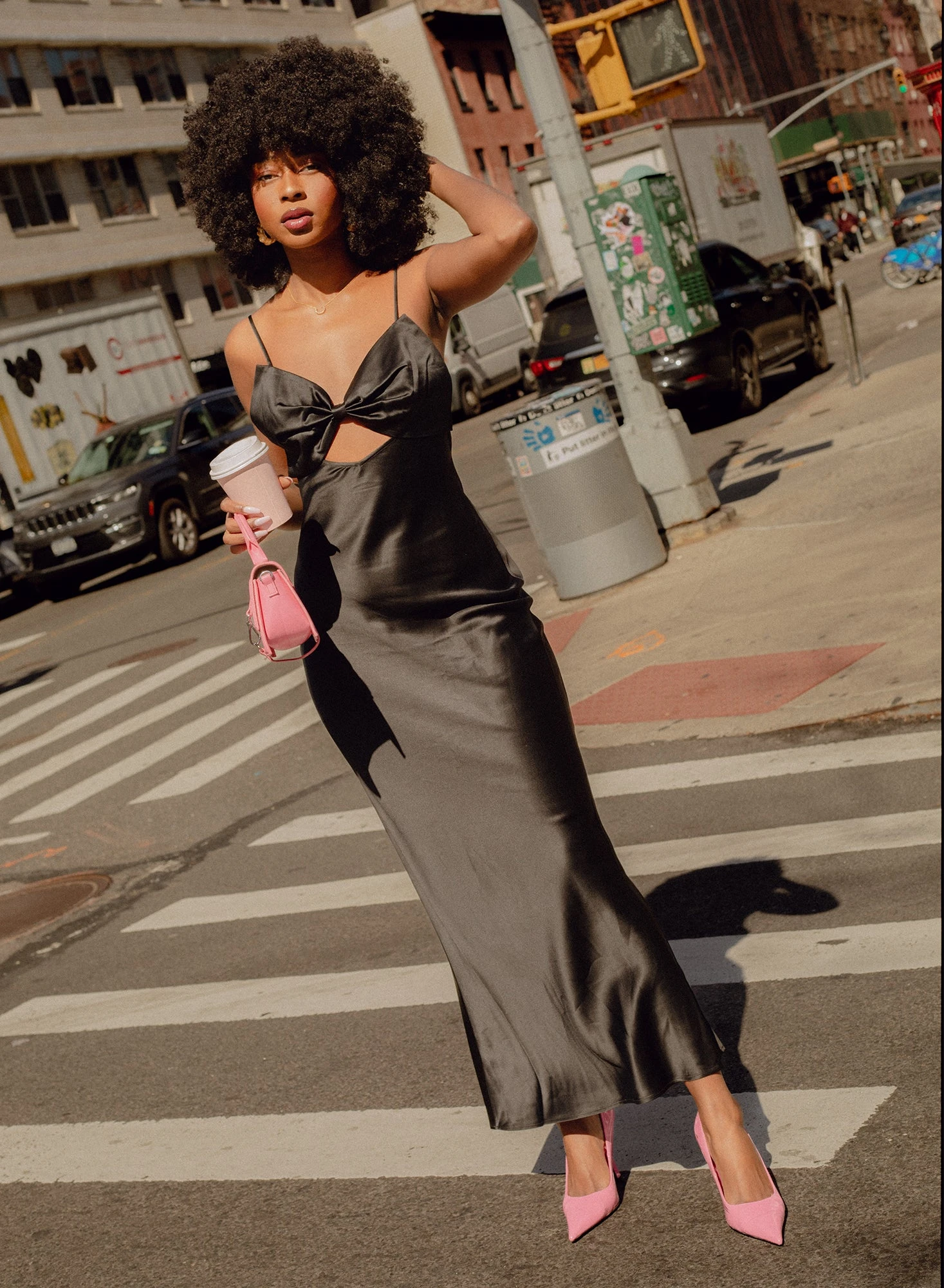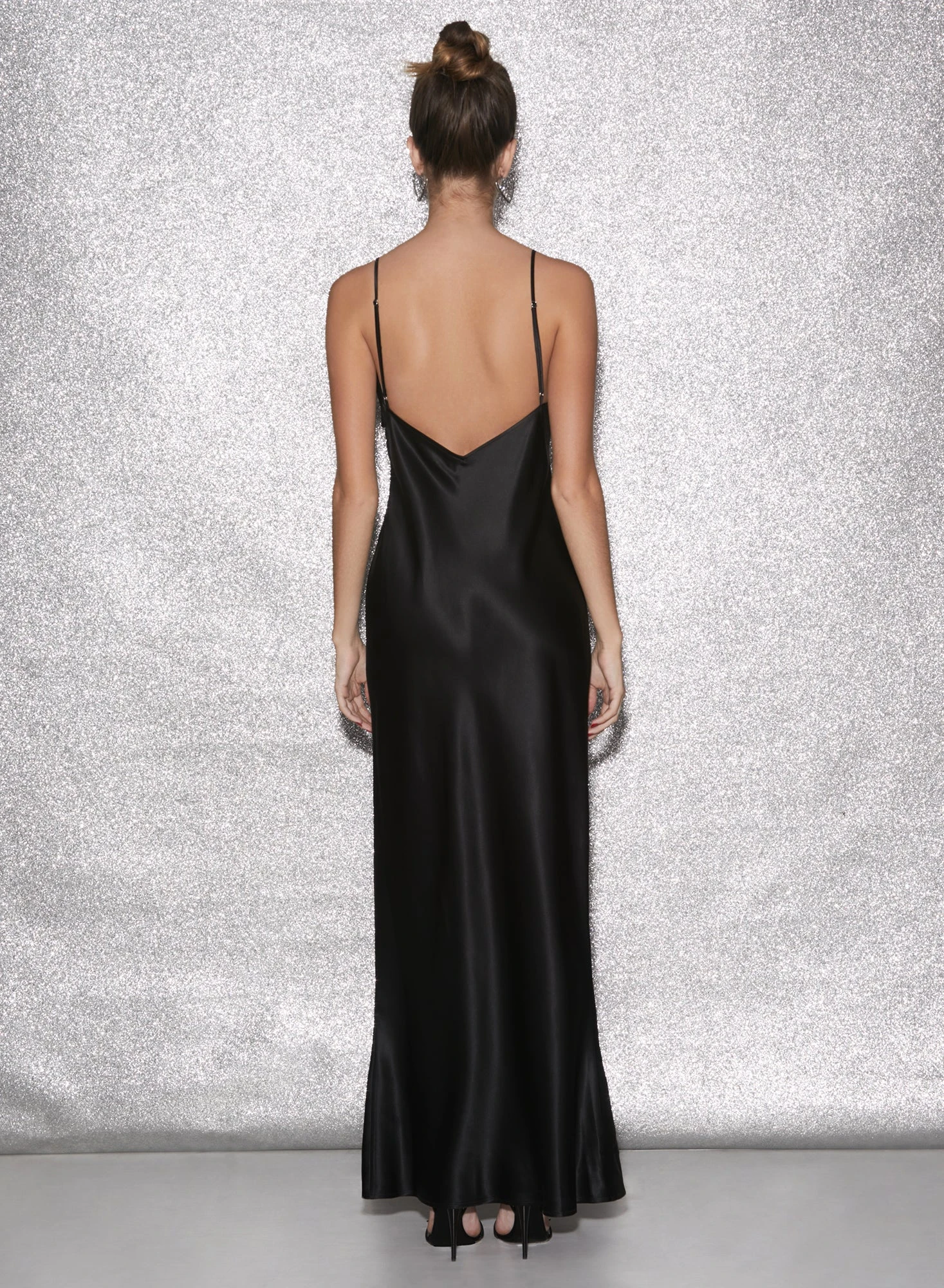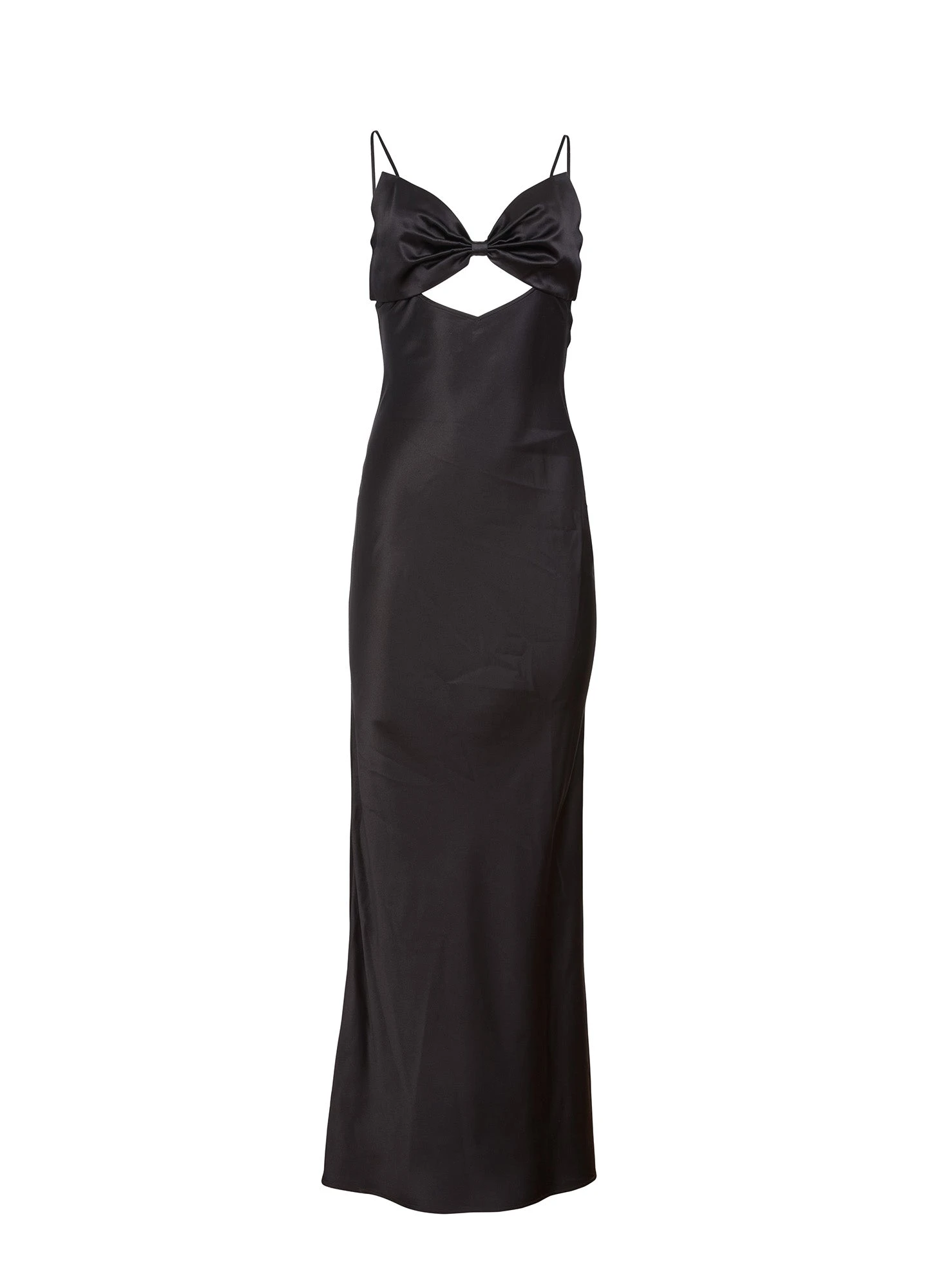 Bow on top. Our ultra chic Bow Slip Dress. Cut from luxe 30MM silk charmeuse that hugs every curve, with over sized bow and flirty front cutout. Features adjustable straps and side zipper closure. Layer over the Luxe Thong for a glam look that works perfectly from the party to the bedroom.