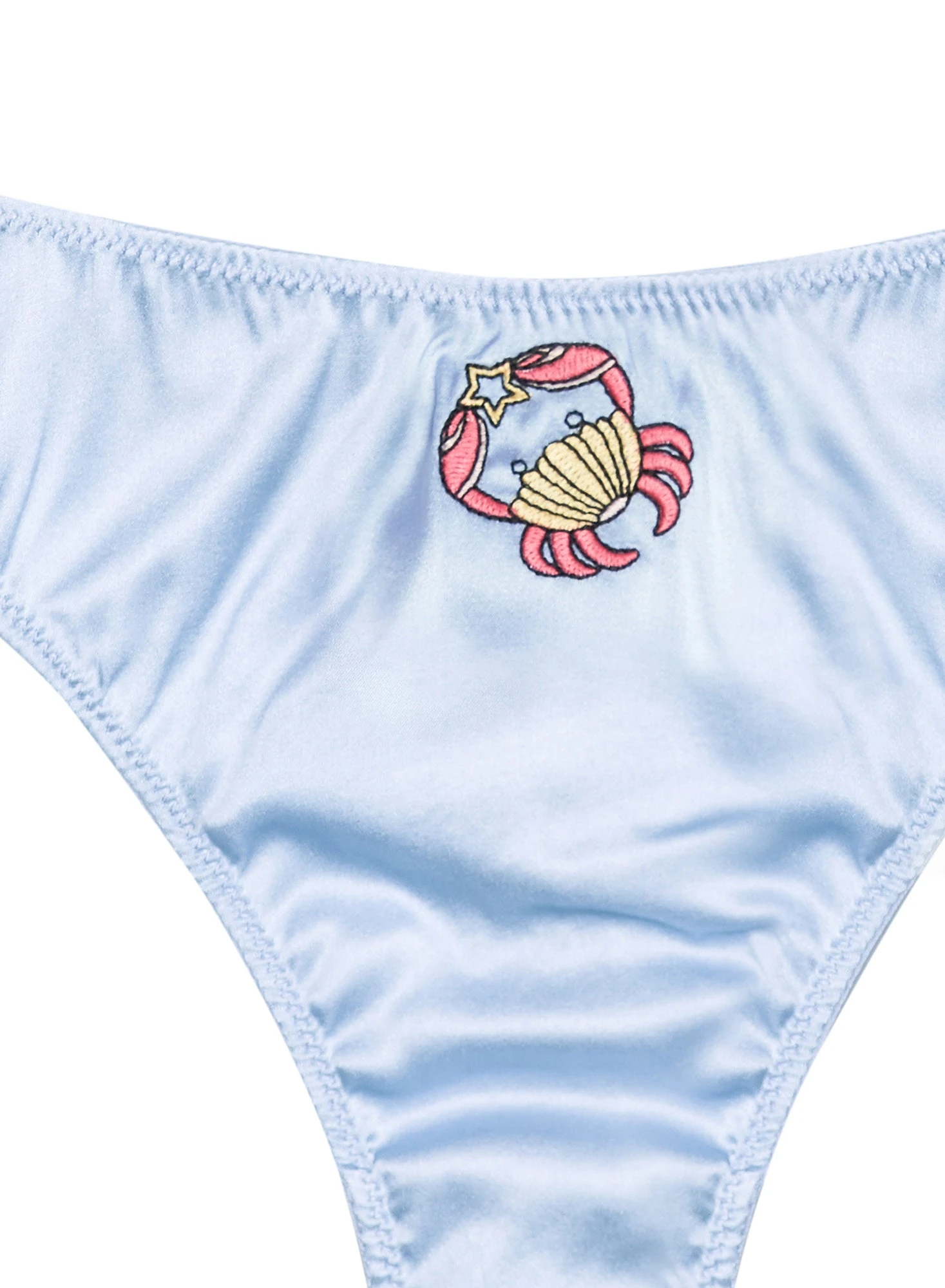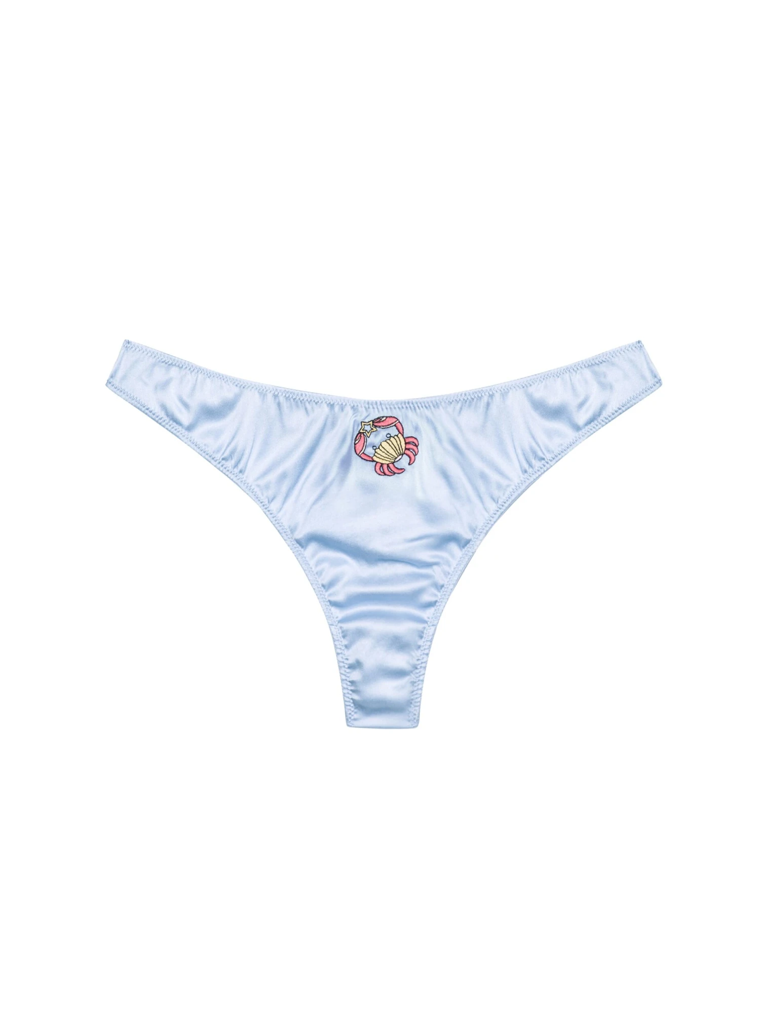 Written in the stars. Our favorite, super comfortable silk thong fits flawlessly under any garment. Features custom zodiac embroidery. Barely there feel with no elastic to dig in. Pair it with the Angel Sleeve Robe.