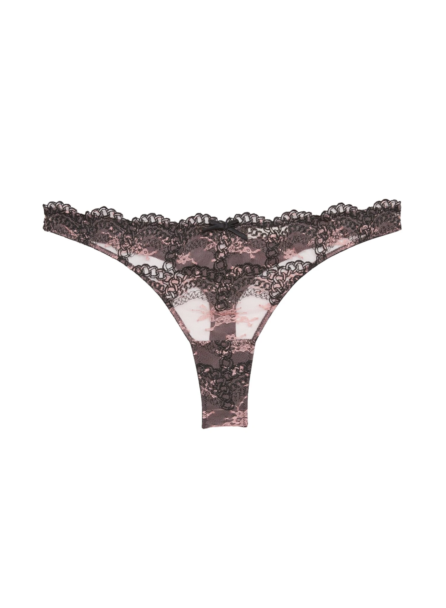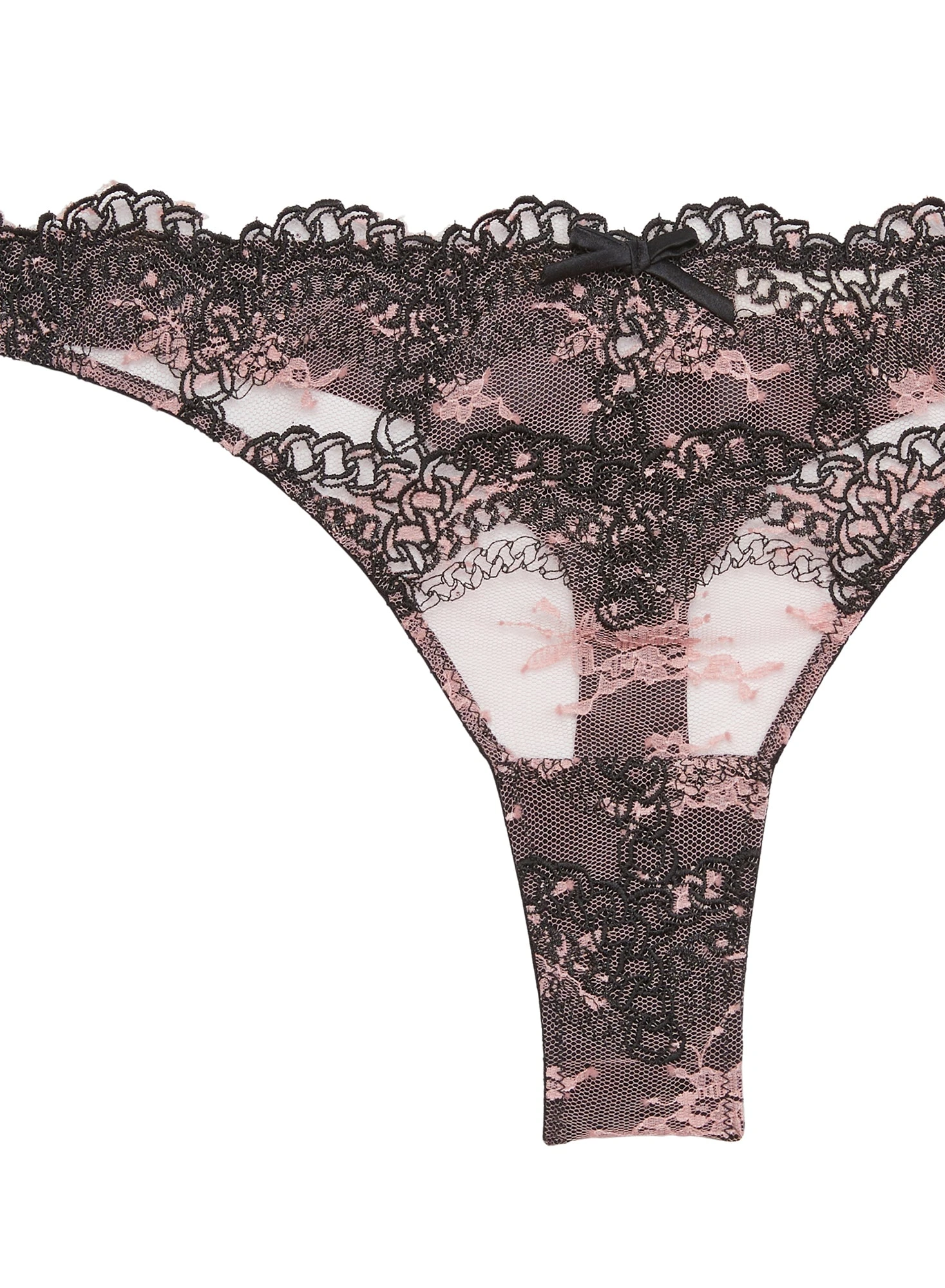 Chain reaction. Our delicate Chain Embroidery Thong, featuring custom Swiss chain embroidery and soft shimmer lurex thread. Ultra flirty scalloped edge with front bow detail. Solid silk back with keyhole detail. Complete this seriously sexy set with the matching Chain Embroidery Bra and Garter.