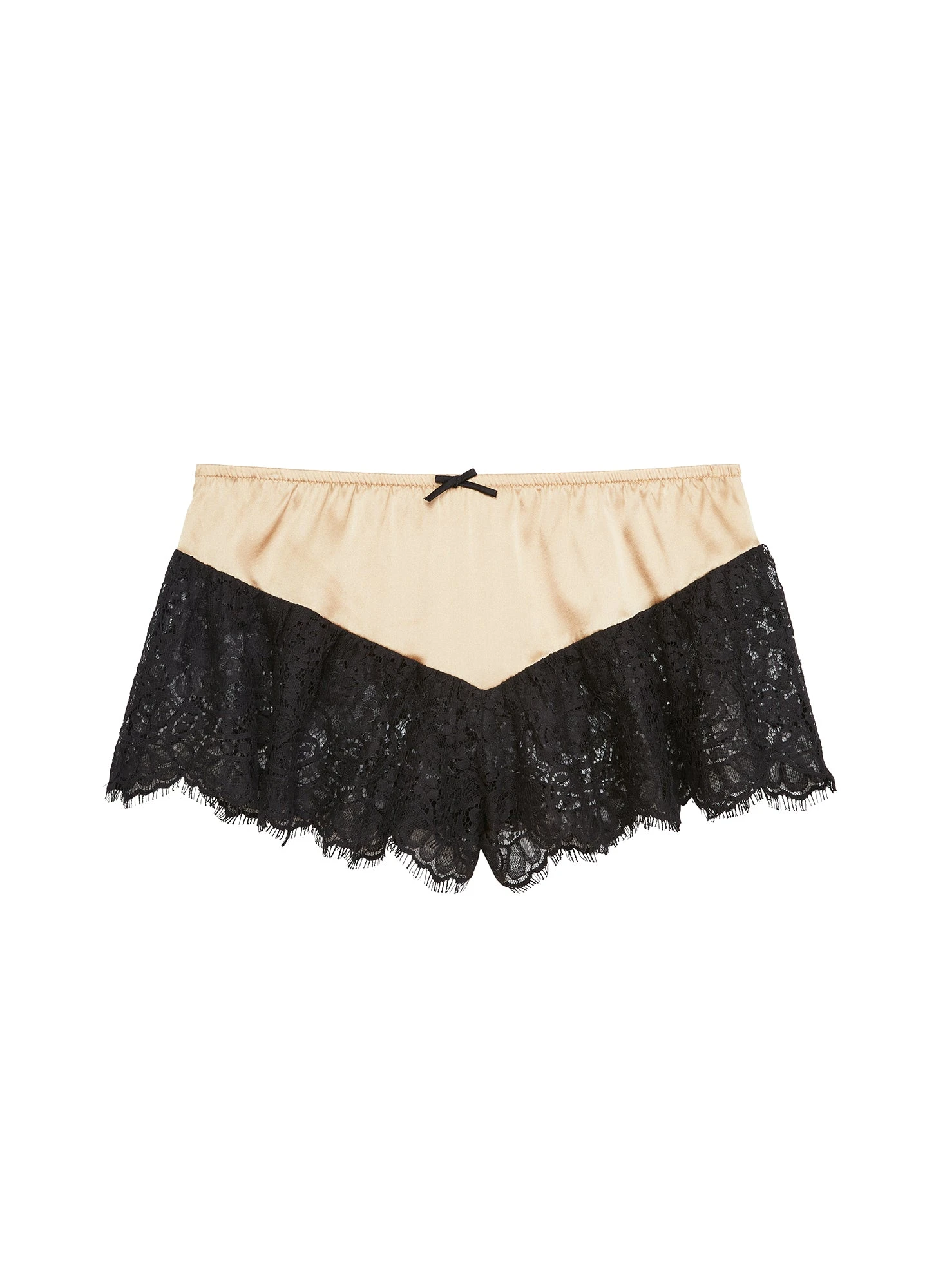 Give them cheek. Our luxe Cherie Lace Flutter Short are the perfect combination of chic and provocative. Features luxe silk body with delicate Italian lace and elastic waist. Flirty cheeky cut and scalloped hem. Pair with the matching Cherie Lace Triangle Bra and Angel Sleeve Robe for a chic nighttime set.