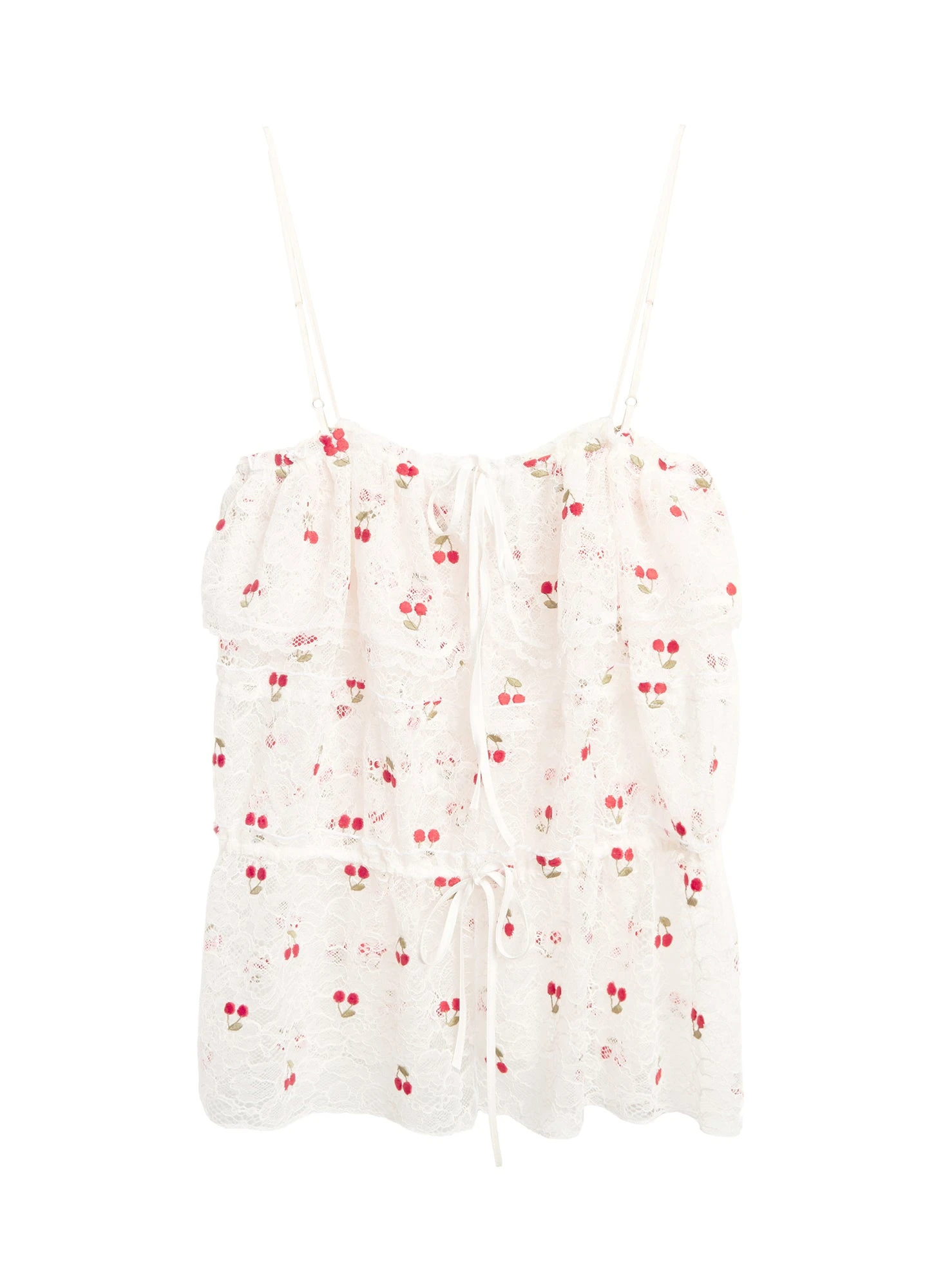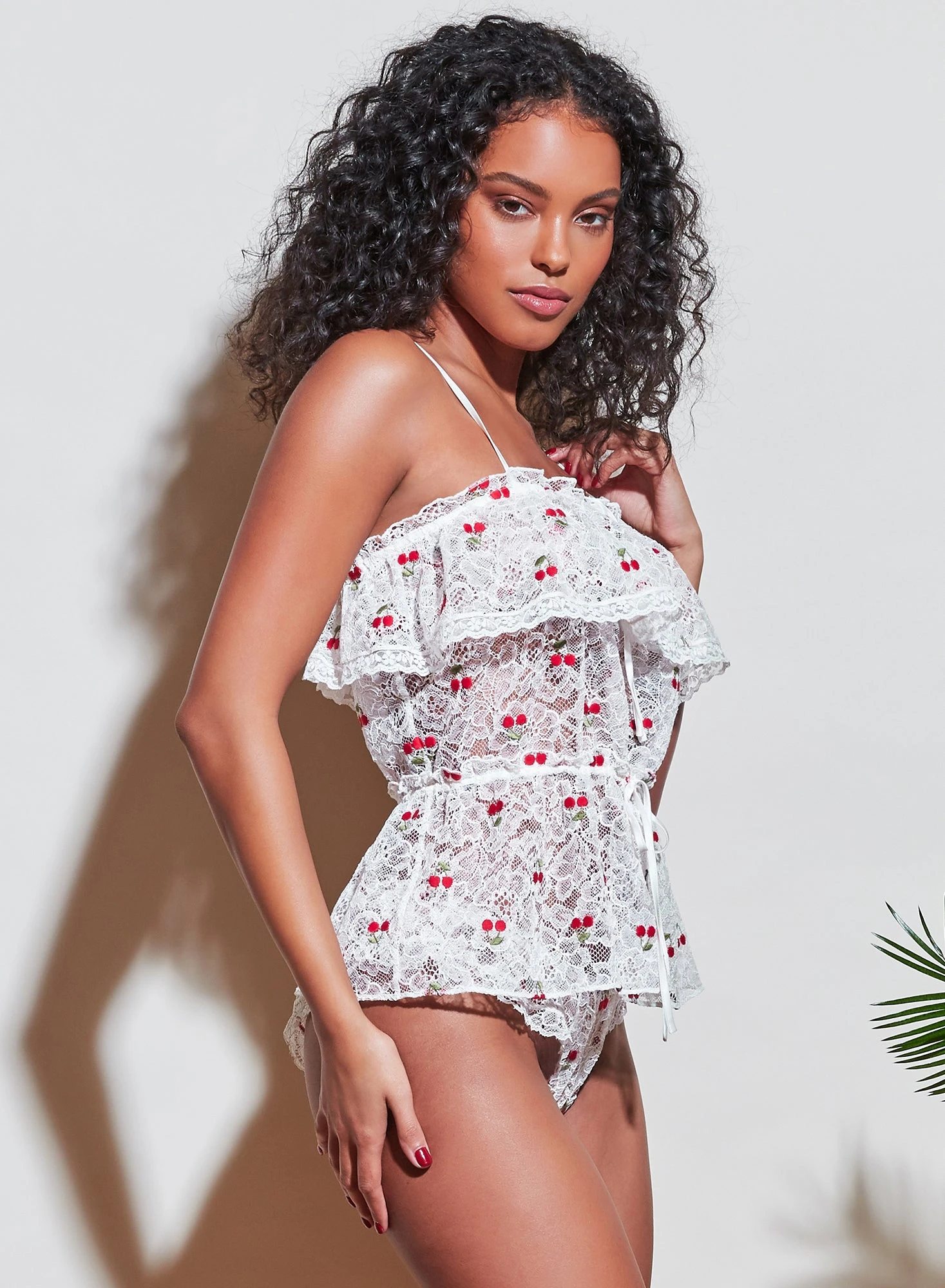 So sweet. Our Cherry Lace Cami features allover cherries embroidered on light and airy lace. Cinched waist to add shape and flatter your figure with top ruffle detail. Adjustable straps. Unlined. Complete this ultra flirty set with the matching Cherry Lace Panty, or take it out with your favorite pair of boyfriend jeans.