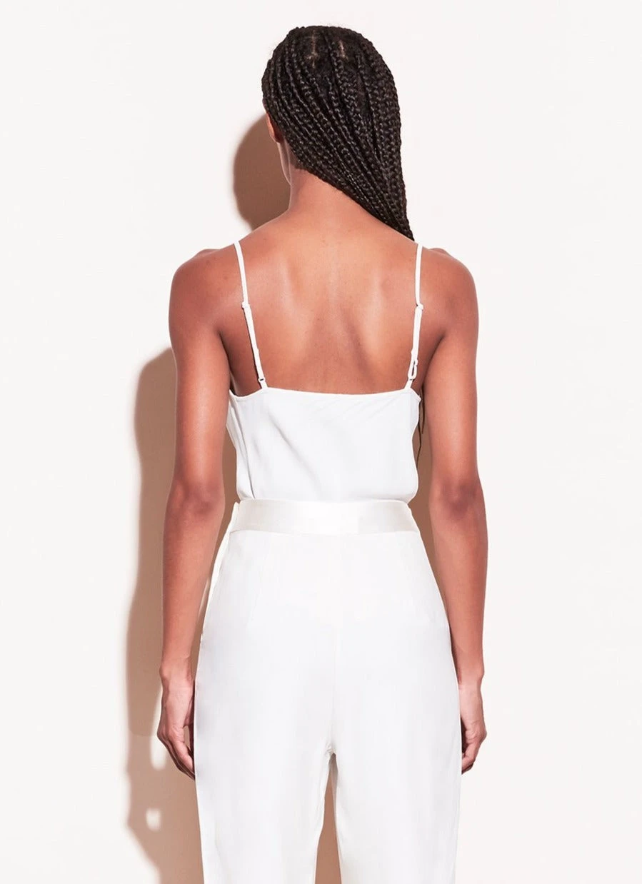 Our lustrous Cowl Neck Spaghetti Strap Cami in ivory is simple and chic. Bias cut silk charmeuse. Adjustable spaghetti straps and draped cowl neck. Perfect with the Ice Cream Embroidery Wide Leg Jean or paired with the Tuxedo Pant for a chic monochromatic look.