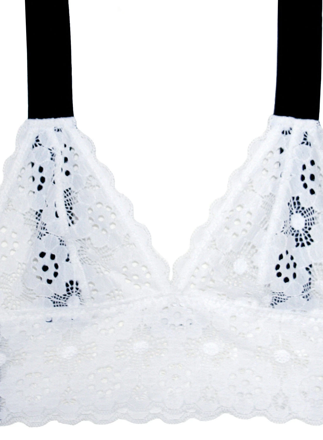 Stretch eyelet lace longline triangle bra. Plunge neckline with leather bow detail. No underwire, unpadded. Silk georgette straps & silk-covered elastic side bands. Perfect under a sheer top, or on its own with high waisted pants or skirt. Pair it with the Crochet Lace Cheeky.