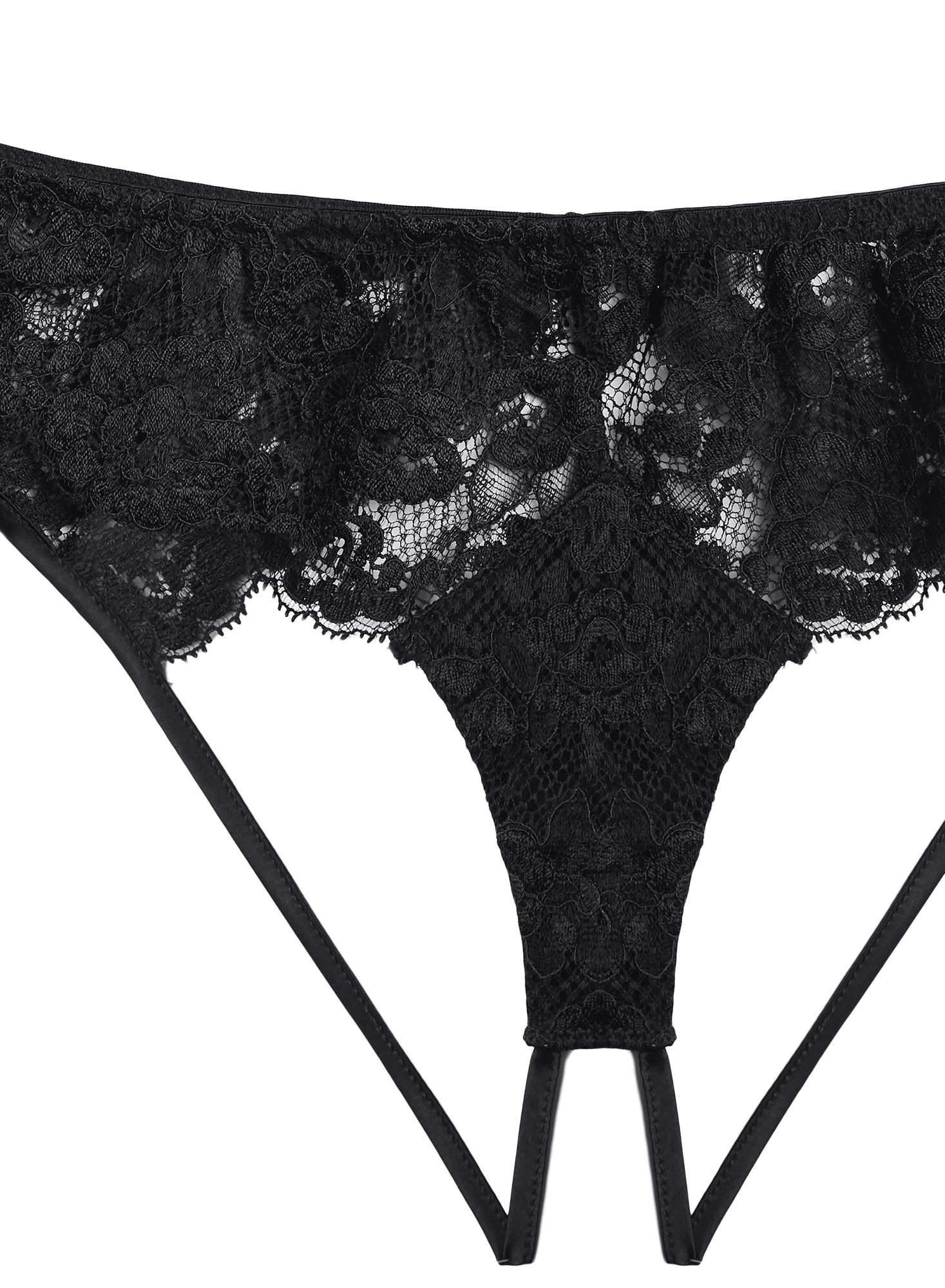 You fox. Our Foxy Lace Ouvert Panty, cut from stunning stretch lace. Crotchless with open back. Complete this seriously sexy set with the matching Foxy Lace Half Cup Bra.