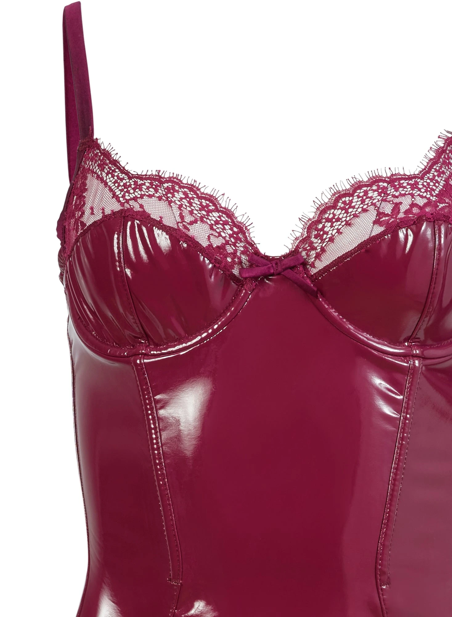 Hey Frankie. Our ultra-hot Frankie Lace PVC Bodysuit combines delicate French Leavers lace with stretch PVC. Underwire cups and boning through the torso create the perfect shape. Features exposed back zipper and a thong cut back. Adjustable straps, snap opening at gusset. Take it out with jeans, or pair it with thigh-highs and heels for the ultimate after-dark look.