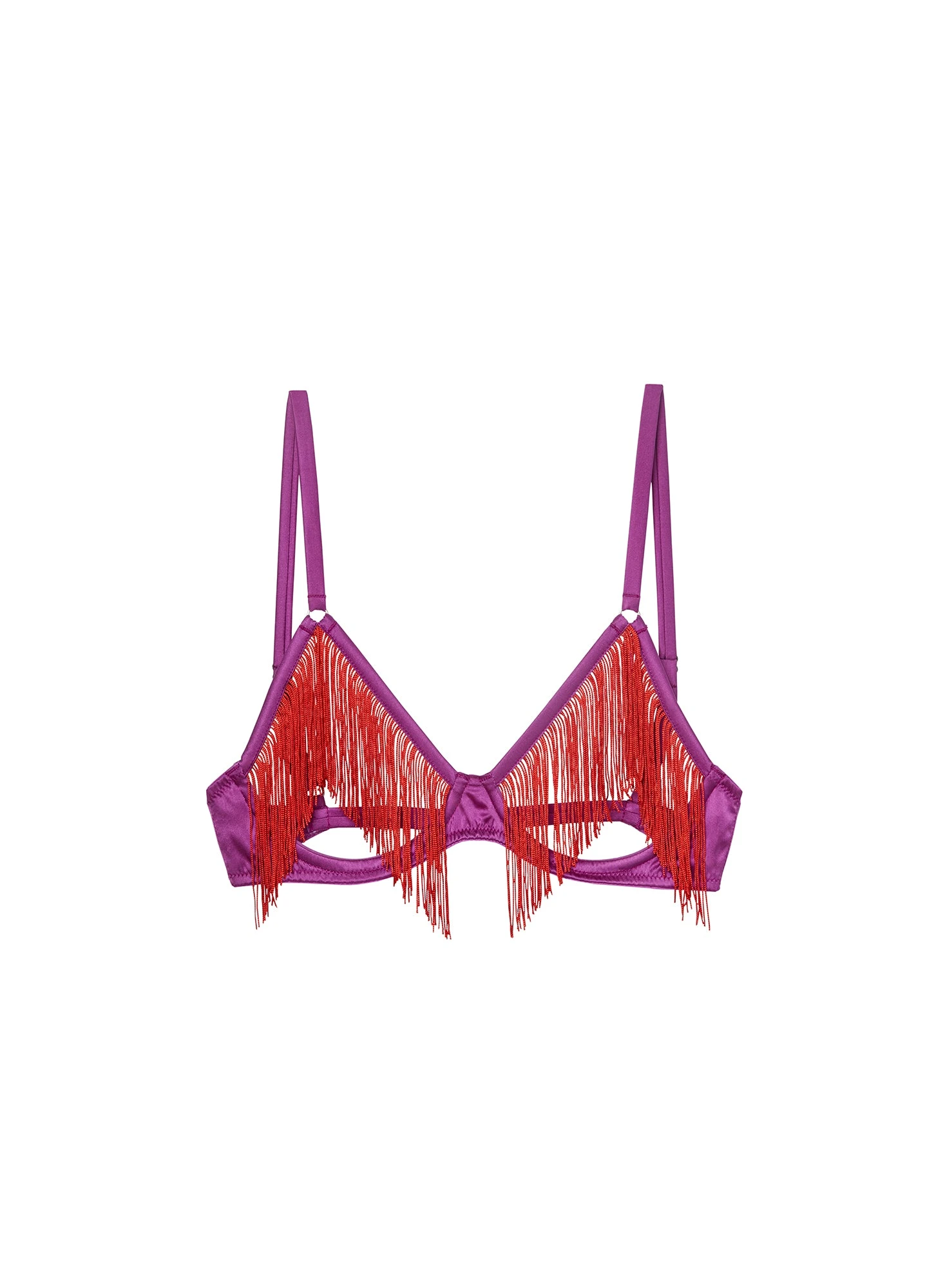 Fringe, with benefits. This ultra hot bondage bra features open, exposed cups with flirty fringe curtain. Underwire and adjustable straps provide subtle shaping and lift. Stretch silk bands with back hook closure. Complete this seriously sexy set with the matching Fringe Ouvert Heart Shaped Panty.