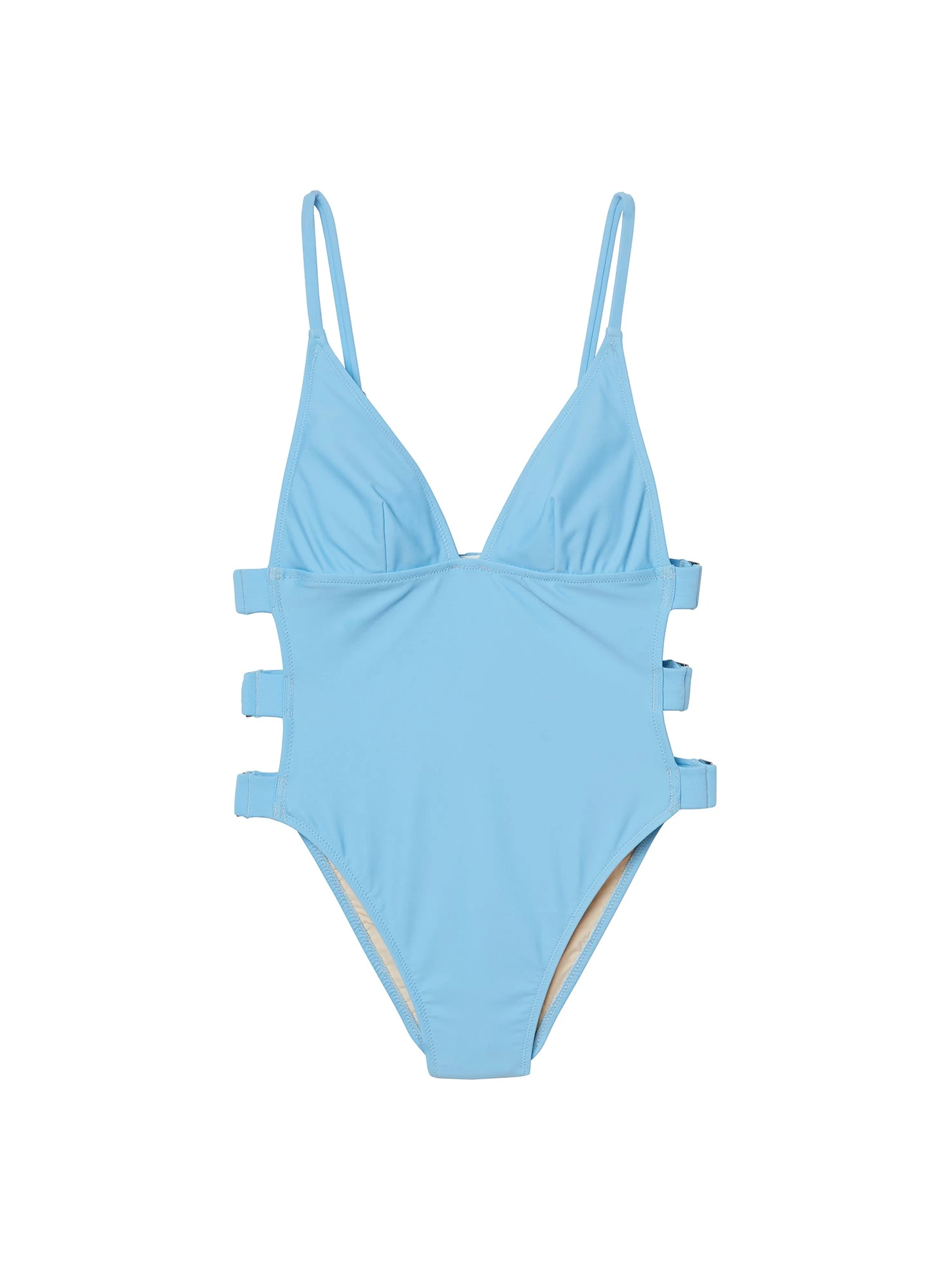 Your yacht or mine? Our High Leg Cutout One Piece is the sexiest swimsuit you’ll ever wear. Features side cutout bands with enamel rings and a deep v neckline. Italian stretch fabric shapes and holds, accentuating your waistline. Fully lined. Playful high leg cheeky cut. Can be worn seamlessly from the bar to beach when styled with our High Waist Twill Short.