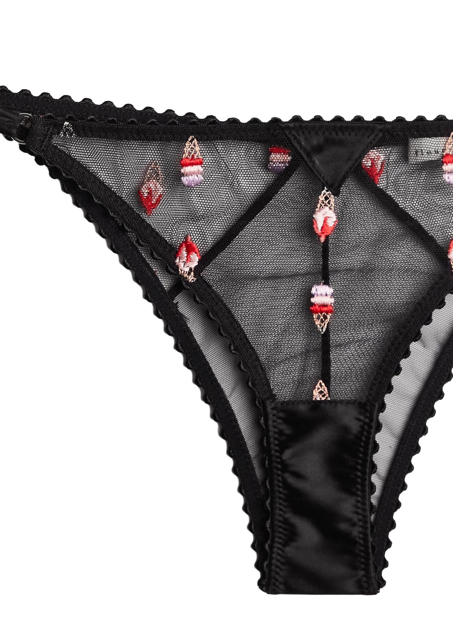 Good enough to eat. Our Ice Cream Embroidery Cheeky features playful custom ice cream cone embroidery on mesh ground. Flirty back bow detail and cheeky fit. Adjustable side straps for the perfect customized fit. Complete this mouthwatering set with the matching Ice Cream Embroidery Demi Bra and Garter Belt.