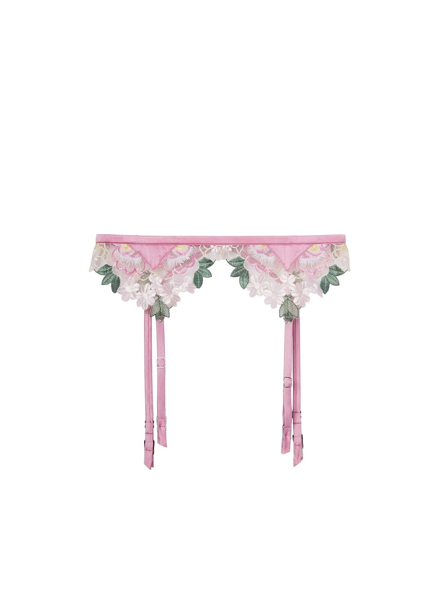 Flower delivery. Our Jardin Embroidery Garter is the perfect addition to amp up your lingerie set. Features delicate, custom floral embroidery with ultra flirty scalloped edge. Silk covered adjustable garter straps and elastic waistband. Center back closure sits at waist. Pair with the matching Jardin Embroidery Demi Bra and Thong.