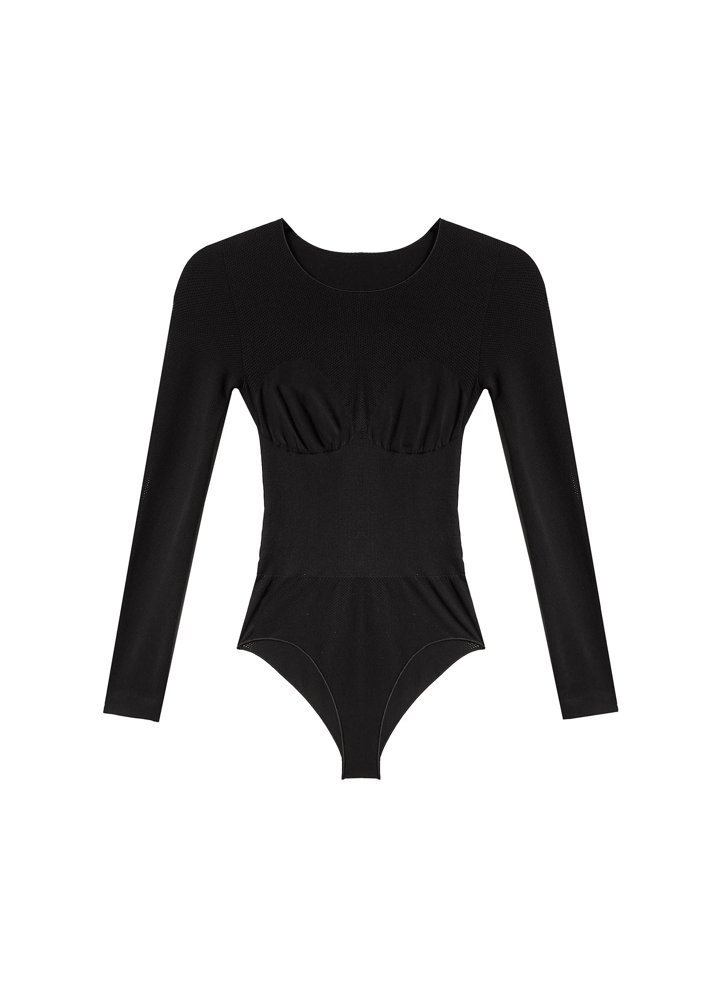 Le Body by Fleur du Mal. The Long Sleeve Control Bodysuit, cut from our new super soft, zero waste knit material. Features ultra breathable perforated knit detailing, with ribbed torso for waist cinching support. Seamless comfort with cheeky back and snap bottom. Works flawlessly as a base layer, or flaunted all on its own.