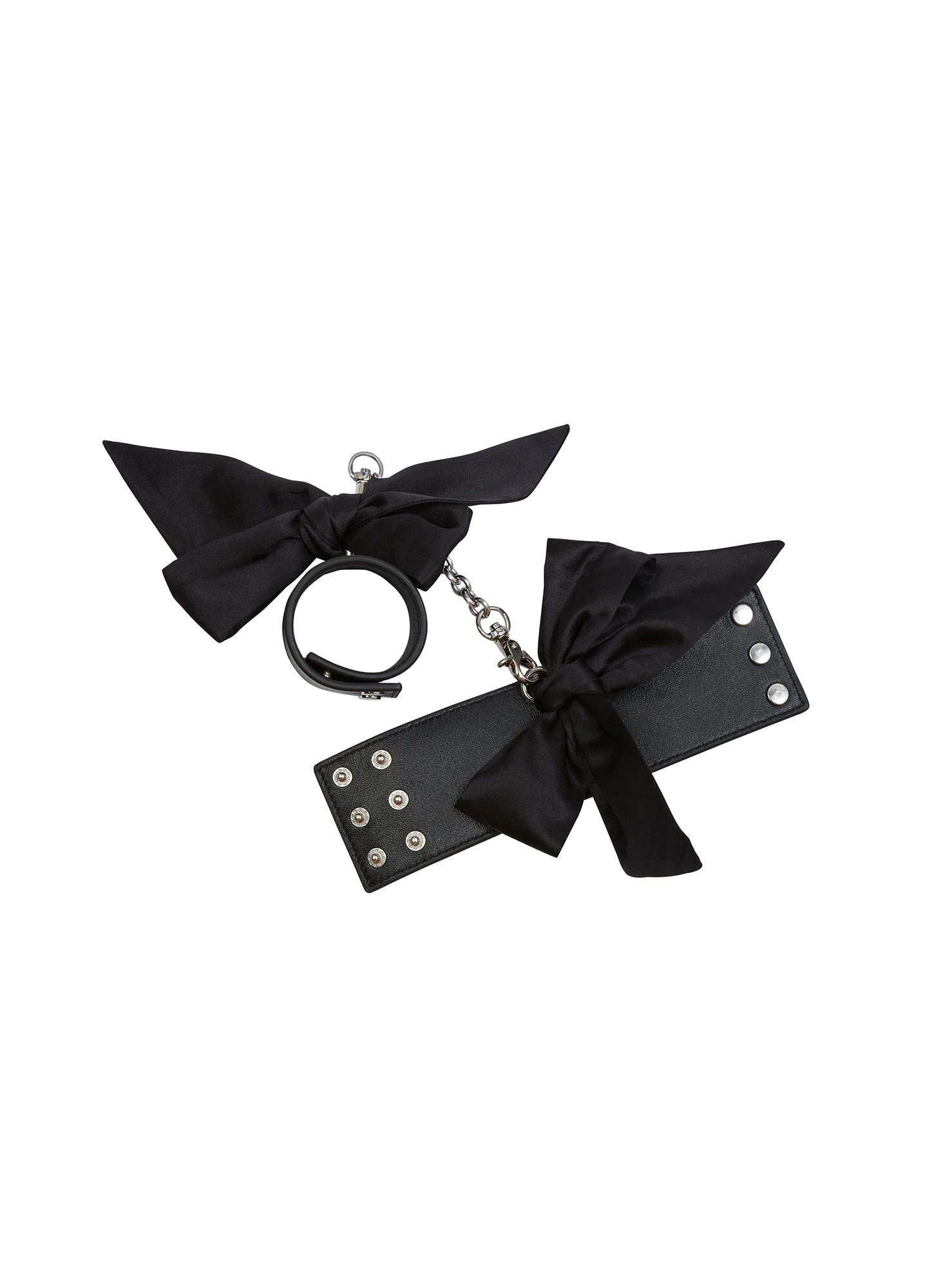 The pleasure’s all mine. Heat things up with our Leather Cuffs with Silk Bows. Leather cuffs feature flirty silk bow accents and detachable chain. Adjustable snap closure. Get tied up with the Charlotte Peekaboo Bra and Crotchless Panty.