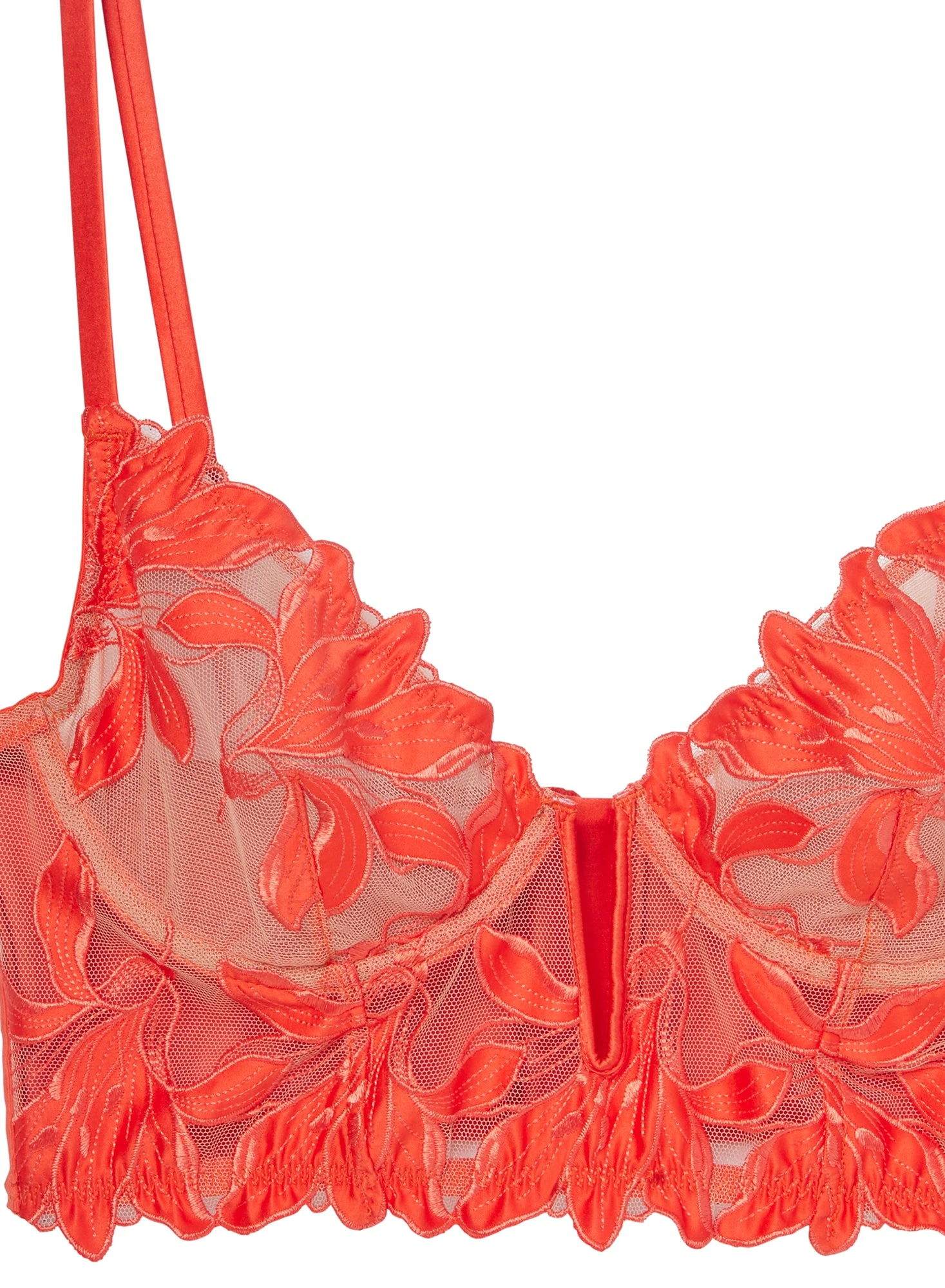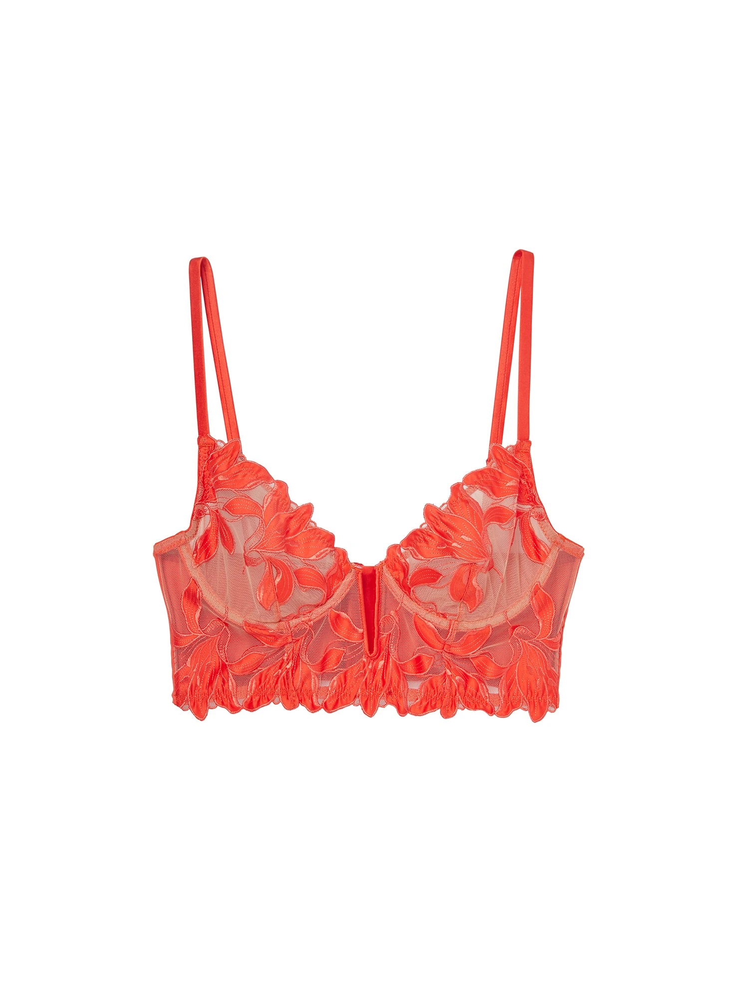 Longing for you. Our Lily Embroidery Longline Demi Bra is our favorite bra top. Floral embroidery lined with stretch mesh across cups and bodice. Underwire with adjustable straps. Boning throughout. Complete the set with the matching Lily Embroidery Thong and Garter.