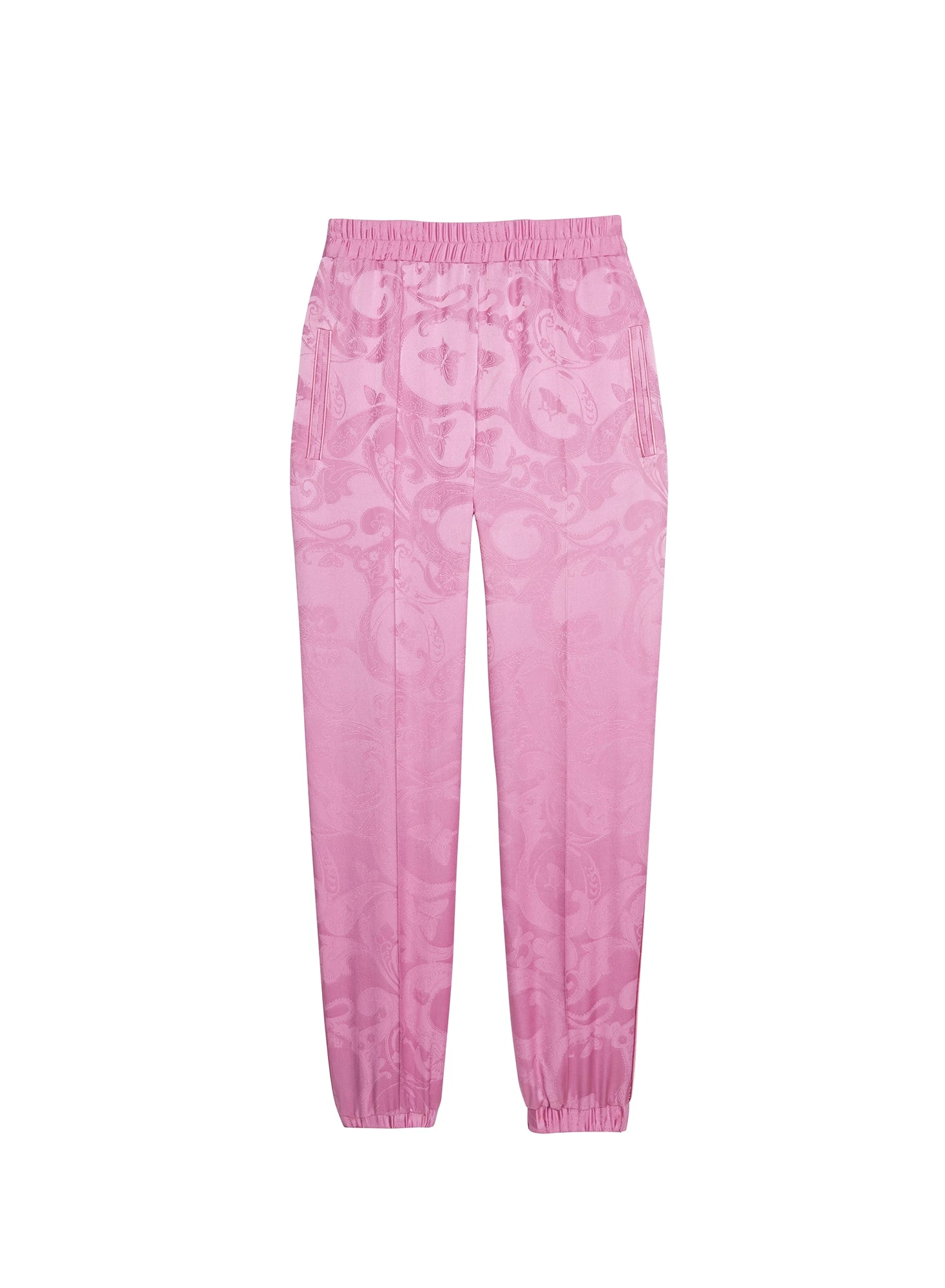 Suit yourself. Our Paisley Jacquard Track Pant, cut from luxe custom paisley jacquard silk. Features flattering tapered fit with elasticized waist and cuffs for style and comfort. Front pocket detail. Pair with the matching Paisley Jacquard Cropped Top for a chic set that works perfectly on the streets or in the sheets.