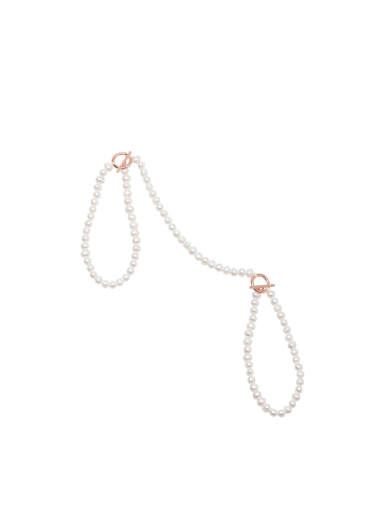 A little tied up. Our stunning hand-beaded Pearl Handcuffs, featuring 100% genuine freshwater pearls with rose gold plated hardware. Delicate, meant for soft play.