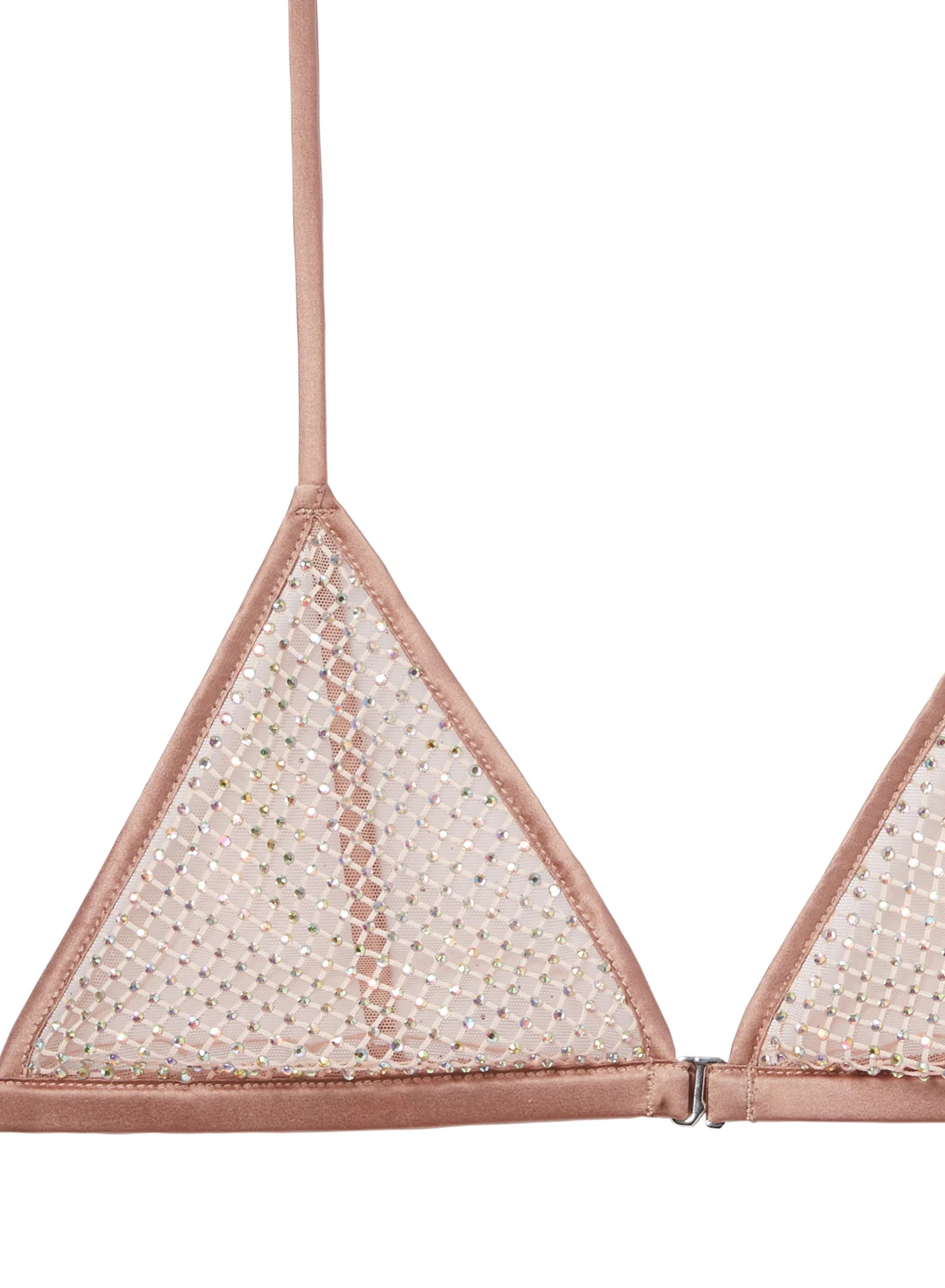 Jaw dropper. Our Rhinestone Fishnet Triangle Bra, cut from sexy sheer mesh with allover crystal rhinestone detailing. Features smooth band and adjustable silk covered straps. Take it out under a blazer, or pair with the Feather Embellished Angel Sleeve Robe and matching Rhinestone Fishnet V String for an intoxicating, after-dark look.