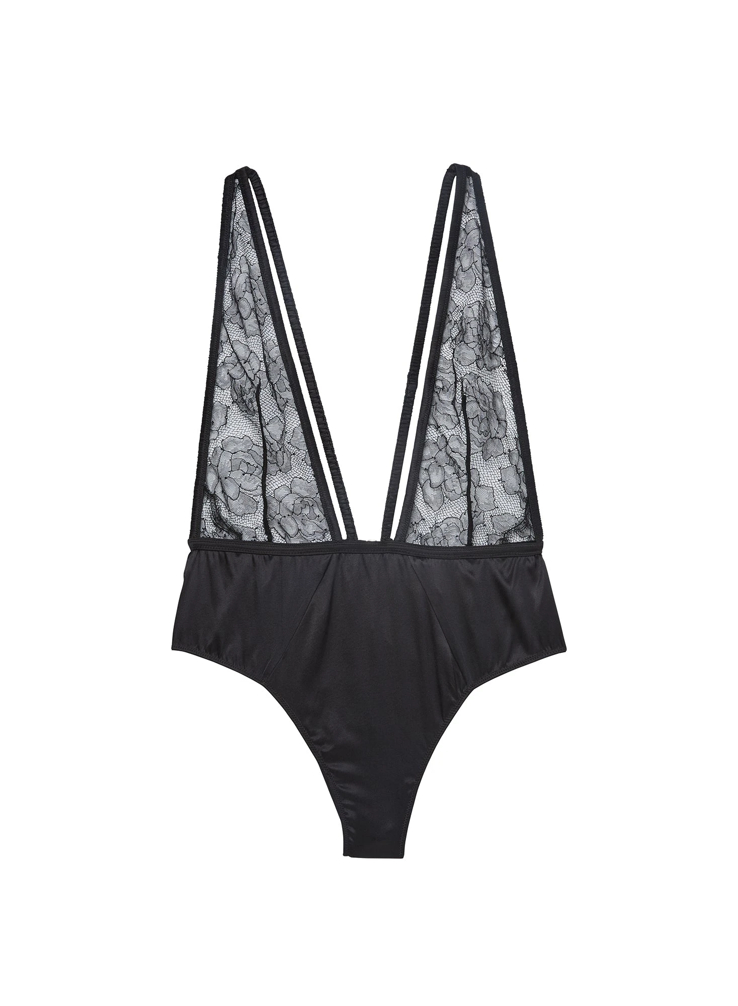 Dare to bare. Our ultra sexy Rose Lace Bodysuit features classic black French Leavers Lace on halter cups, with a luxe stretch silk panty. Flattering plunge neckline with silk ruched straps and flirty back keyhole detail. Cheeky cut back. Flaunt this stunning after-dark piece with the Veiled Bunny Ears.
