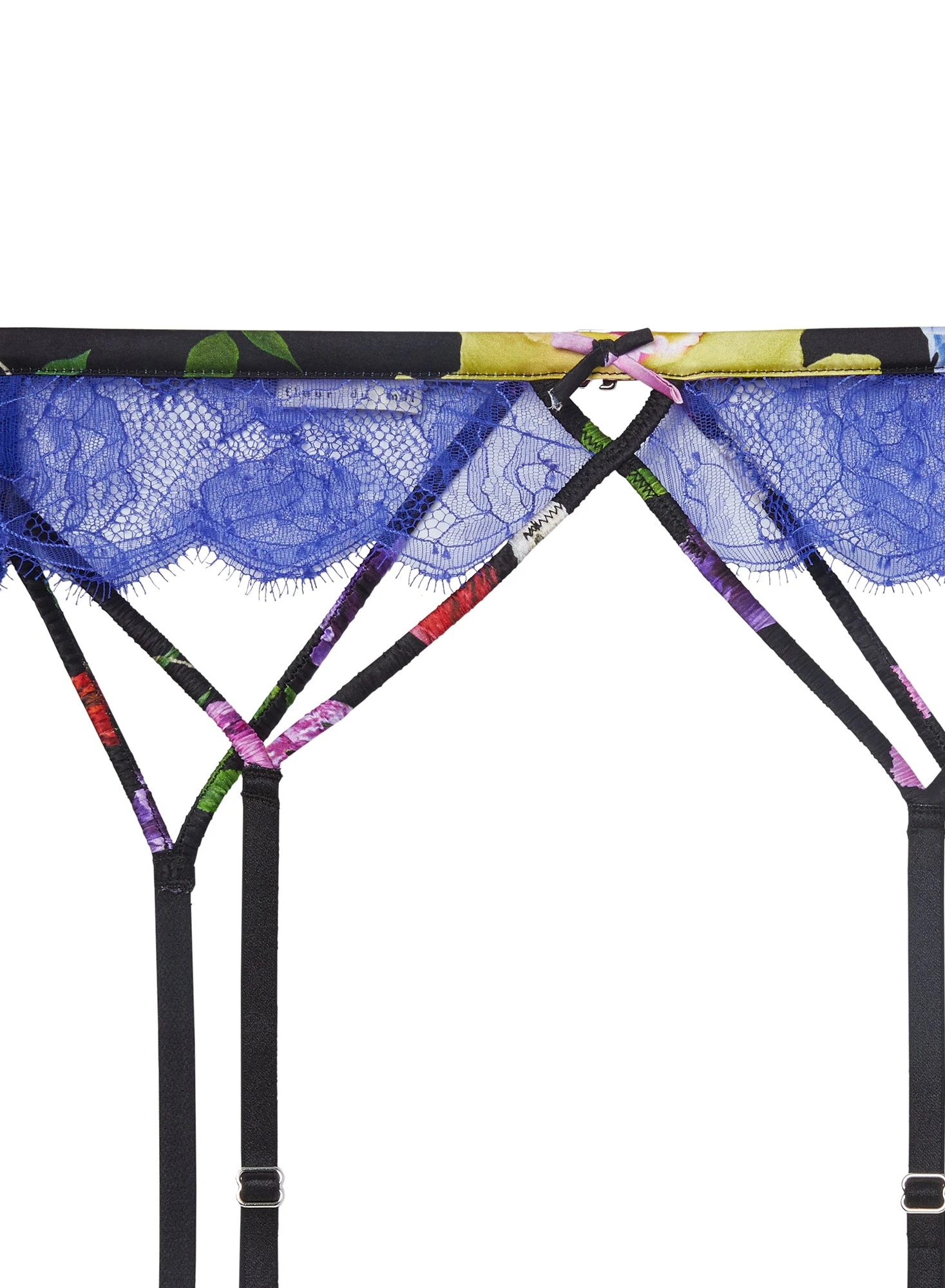 Our Rose Lace Garter is the perfect addition to amp up your lingerie set. Features delicate electric blue French lace paneling, with custom floral printed silk covered adjustable garter straps and elastic waistband. Center back closure sits at waist. Complete this stunning set with the matching Rose Lace Balconette and Thong.