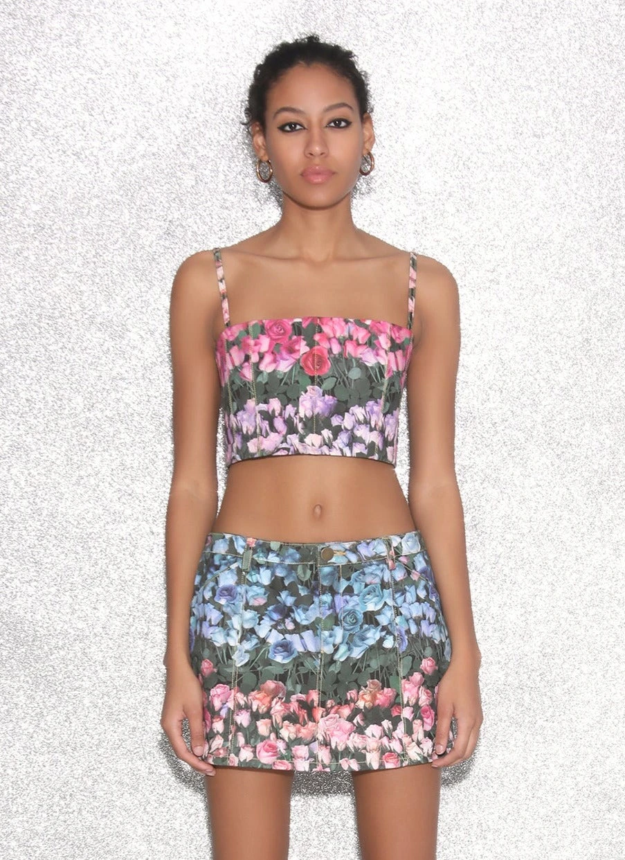 Our flirty Rose Stripe Denim Mini Skirt, in our custom floral rose stripe pattern. Low rise fit with front and back pockets. Features zip fly closure with antique brass hardware. Take it from brunch to bar with the matching Rose Stripe Denim Top or Linear Pointelle Cutout Bodysuit.