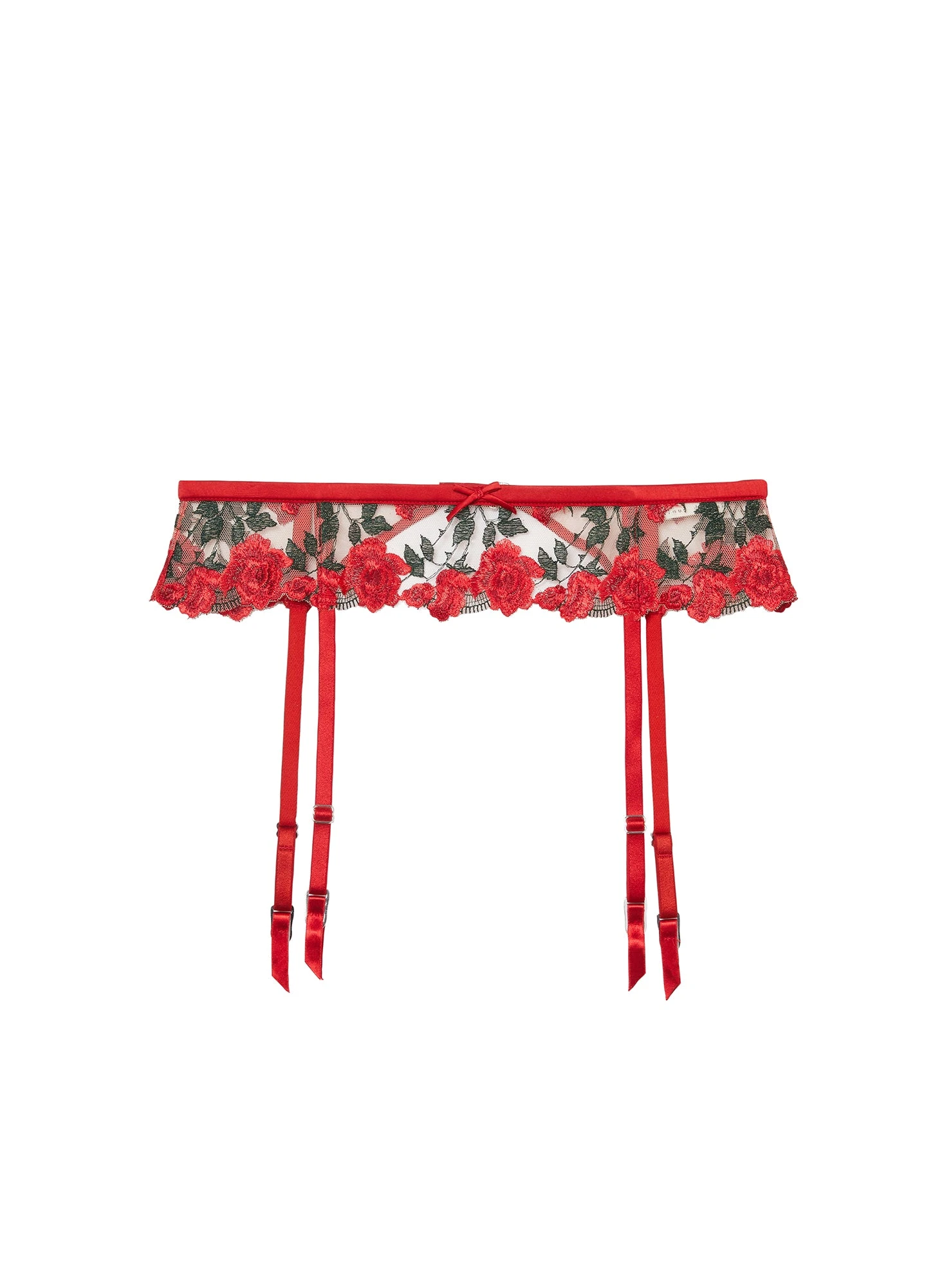 Our Roses & Thorns Garter is the perfect addition to amp up your lingerie set. Features custom rose embroidery with Fleur logo thorns. Silk covered adjustable straps and elastic waistband, with flirty scalloped edge. Center back closure sits at waist. Complete this seriously sexy set with the matching Roses & Thorns Demi Bra and Thong.
