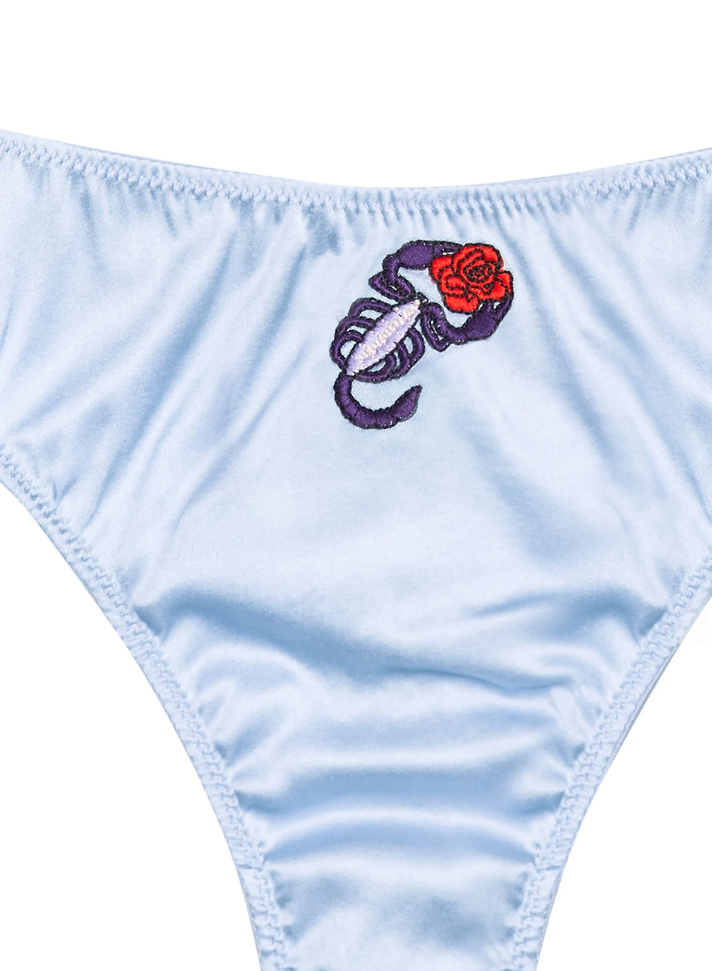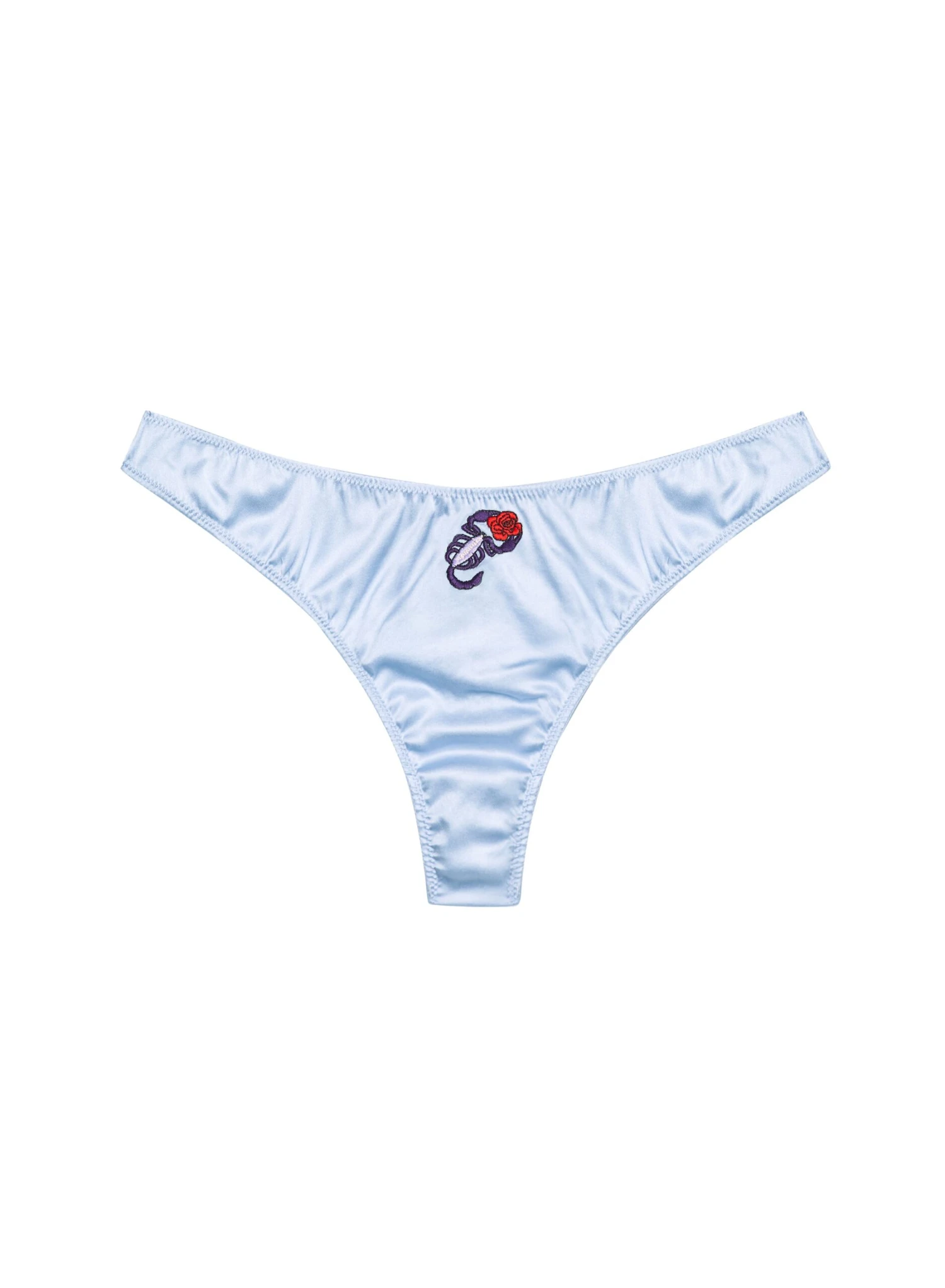 Written in the stars. Our favorite, super comfortable silk thong fits flawlessly under any garment. Features custom zodiac embroidery. Barely there feel with no elastic to dig in. Pair it with the Angel Sleeve Robe.
