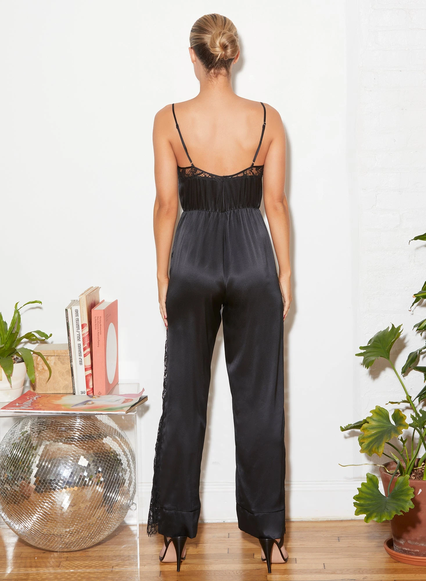 Our luxe Silk and Lace Jumpsuit features front button detailing and an elasticized waist to add shape and flatter your figure. Lace paneling on sides and neckline heats things up. Take it to the bar with your favorite Essentiels panty, or layer over a bikini for a chic poolside look.