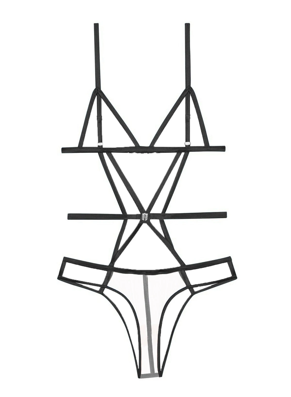 Bare it all. Our new take on a classic favorite, the stretch Silk Strappy Bondage Bodysuit features straps crossing throughout the torso and back. Ouvert. Pair this head-turner with the Angel Sleeve Robe.