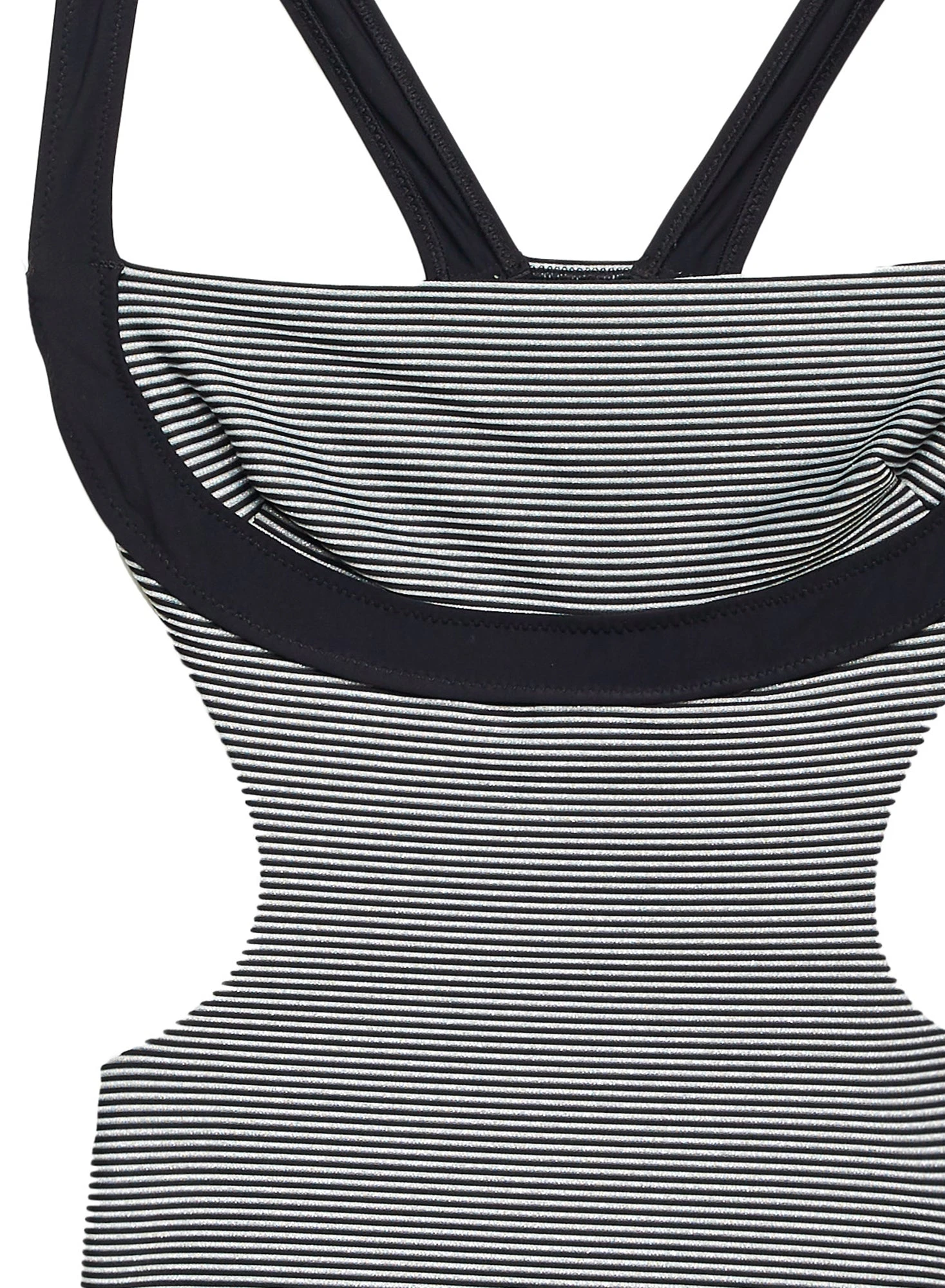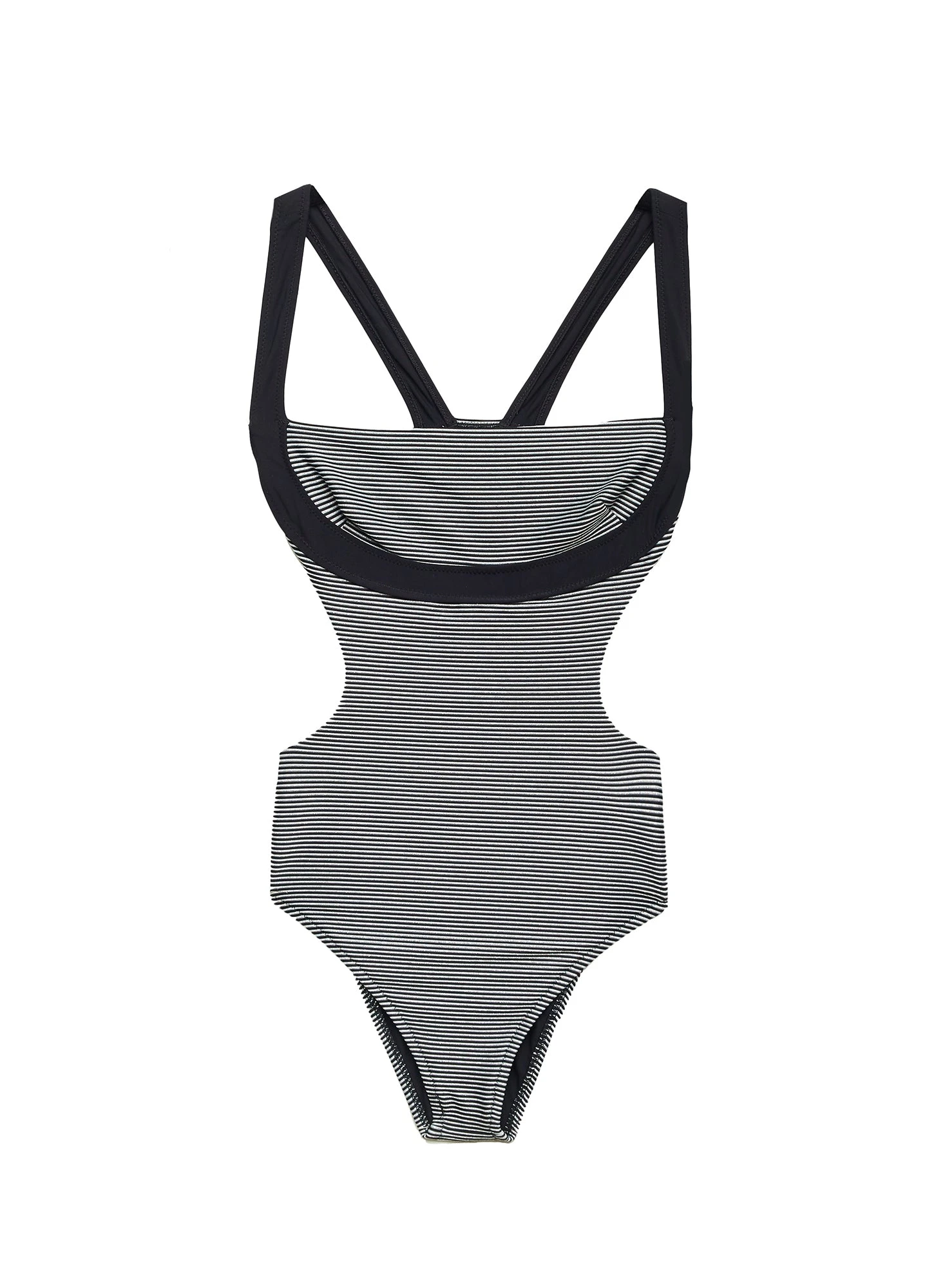 Side to side. Our U-Line Cutout One Piece cut from Italian stretch fabric that retains shape and holds you in. Features side cutouts to accentuate your waist and u-line detail under bust to provide subtle lift and support. Fully lined. Looks chic with the Washable Silk PJ Pant.
